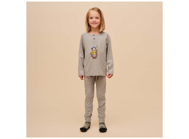 Rett modell med en tidløs rund hals og en knappestolpe i front, som gjør påkledningen enkel og rask. Justerbar elastisk linning med snorstramming gir barnet full bevegelsesfrihet, samtidig som det holder pysjen på plass. Dette pysjsettet kombinerer Flåklypas unike design med behagelig kvalitet og mer bærekraftige materialer, ideelt for en god natts søvn og en god start på morgenen.